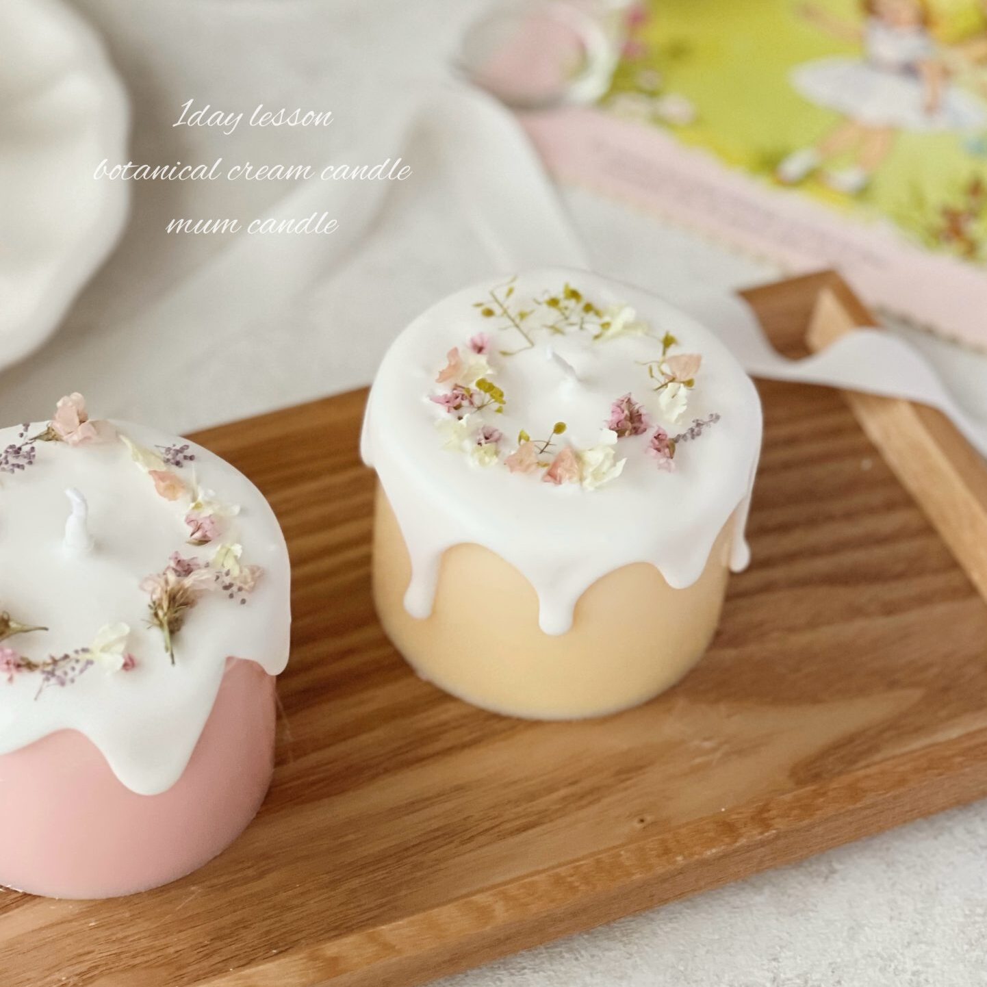 ベースキャンドルにクリームを垂らして、小花を散らしてデコレーションします🌷