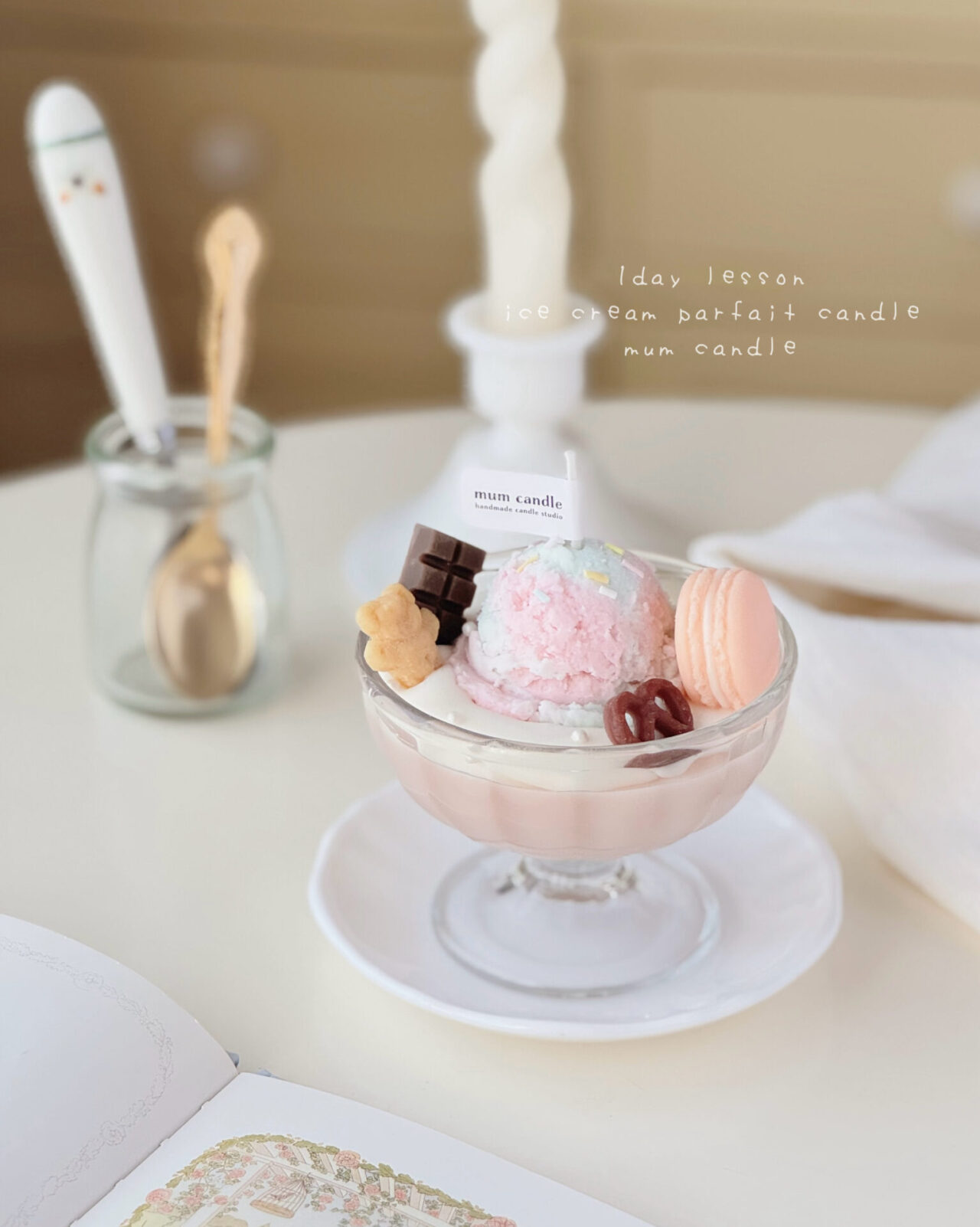 コンテナキャンドルの上にクリームを注ぎ、アイスクリームとお好みのパーツをデコレーションしてパフェ風に仕上げます